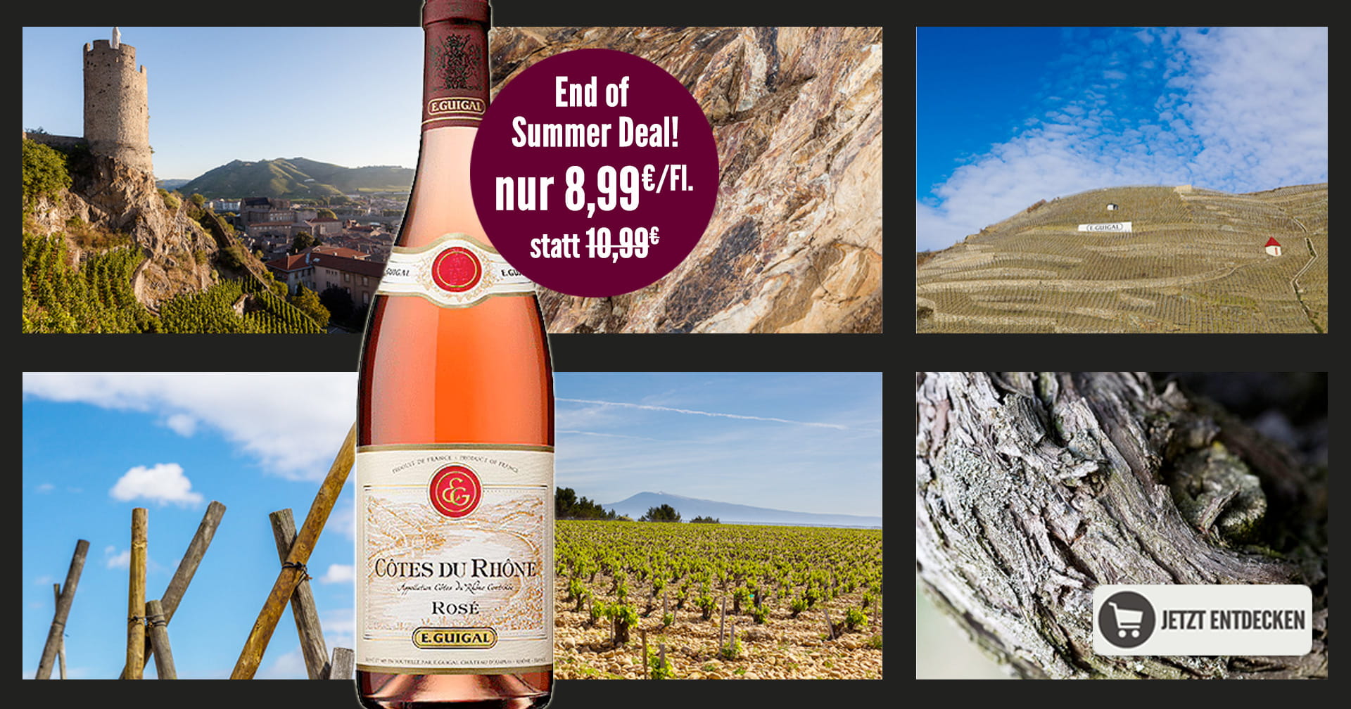 Im Rhônetal hat der Roséwein mit der Appellation Tavel eine geschützte Herkunftsbezeichnung exklusiv für Roséweine! Das Maison Guigal füllt aus dieser Appellation sogar bereits seit dem 1940er Jahrgang Weine ab und verfügt somit über eine ausgezeichnete Expertise, wenn es um Roseweine von der Rhône geht. Während ein guter Tavel fast nicht unter 15€ zu bekommen ist, hat das Weingut Guigal mit dem Côtes du Rhône Rose eine hervorragende Alternative zum mehr als fairen Preis im Angebot.