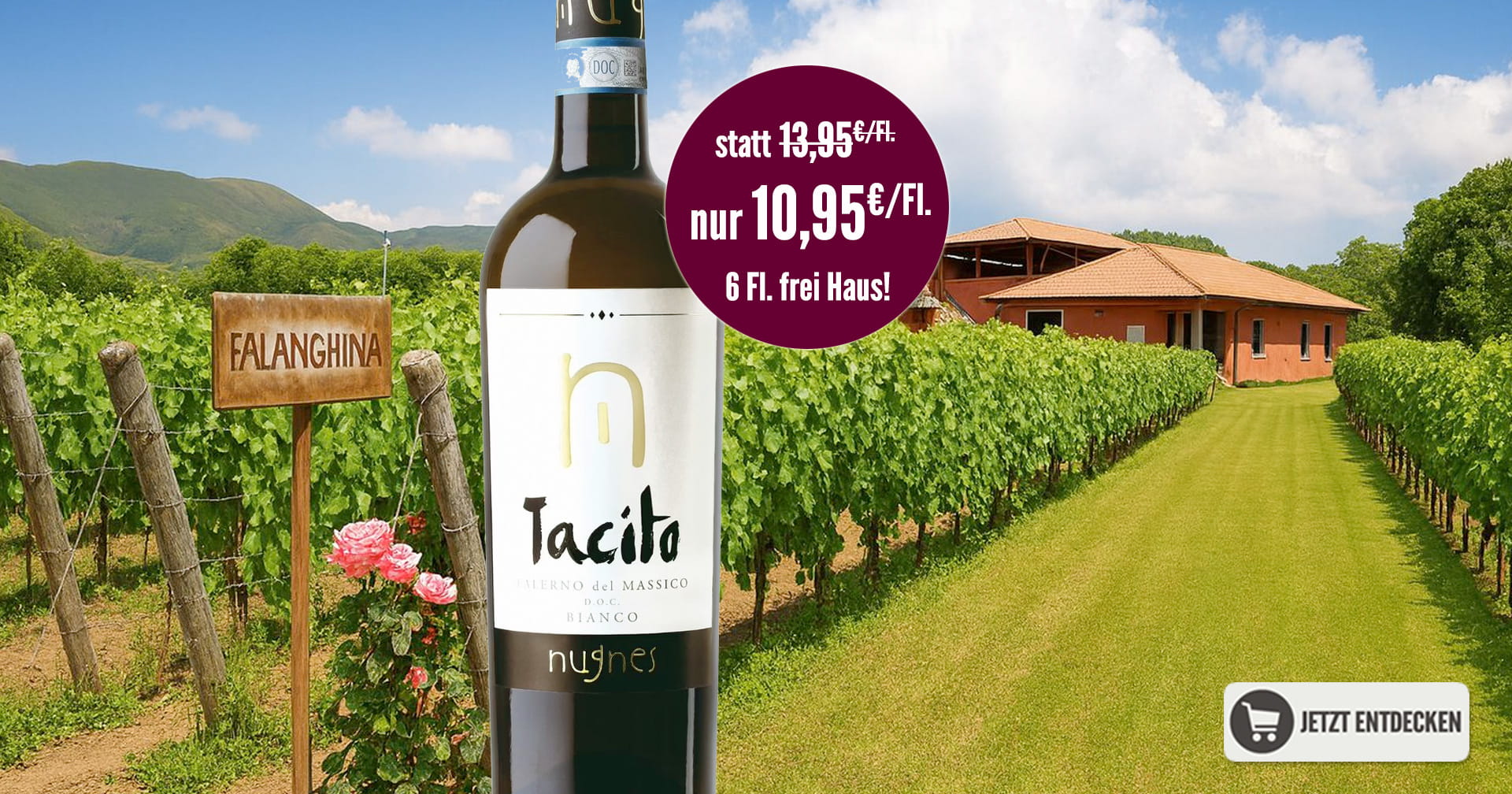 Traube, während der Ausbau auf der Feinhefe ihm zusätzliche Tiefe und eine wunderbar harmonische Textur verleiht. Dieser Wein ist ein perfekter Begleiter zu leichten Gerichten, sei es gegrillter Fisch, eine knusprige Pizza oder asiatische Küche. Er ist ein Wein, der einfach Freude macht und die Sonne Kampaniens in die Flasche bringt. Ein echter Tipp für alle, die einen unkomplizierten, aber dennoch charaktervollen Weißwein suchen. 2023er Falanghina Tacito - Nugnes nur 10,95€ statt 13,95€/Fl.